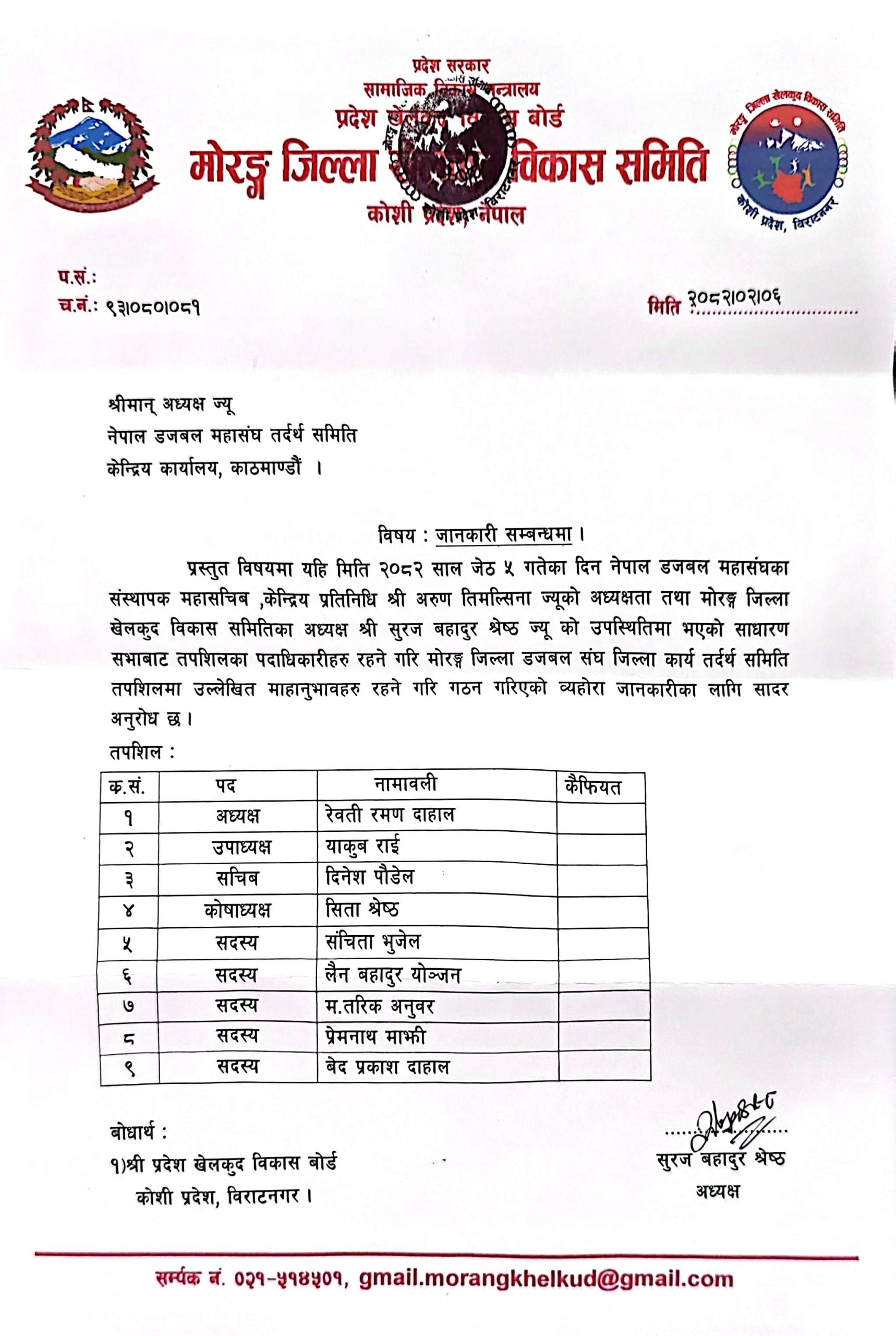 मोरङ– मोरङ जिल्लामा डजबल खेलको प्रवर्द्धन र संस्थागत विकासका लागि मोरङ जिल्ला डजबल संघको तदर्थ समिति गठन गरिएको छ। नेपाल डजबल महासंघका संस्थापक महासचिव तथा केन्द्रिय प्रतिनिधि अरुण तिमल्सिनाको अध्यक्षता र मोरङ जिल्ला खेलकुद विकास समितिका अध्यक्ष सुरज बहादुर श्रेष्ठको विशेष उपस्थितिमा सम्पन्न भेलाबाट उक्त समिति गठन गरिएको हो।